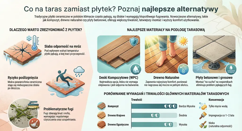 Tradycyjne płytki ceramiczne od lat dominują na tarasach i balkonach, ale coraz więcej właścicieli nieruchomości szuka skuteczniejszych alternatyw. Powody są konkretne: płytki pękają pod wpływem mrozu, nagrzewają się w słońcu i stają się niebezpiecznie śliskie po deszczu. Na szczęście rynek materiałów wykończeniowych oferuje dziś rozwiązania trwalsze, bezpieczniejsze i często prostsze w montażu.