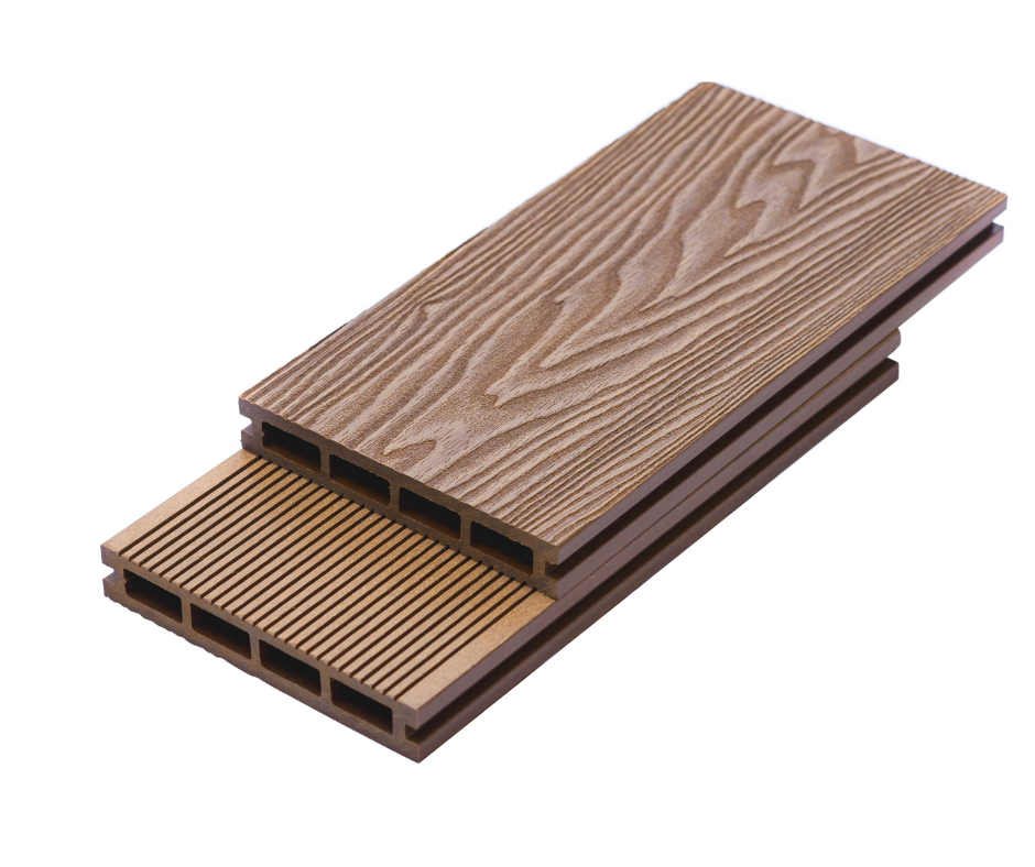 Elegant Light 3D to wyjątkowy wzór desek tarasowych. Z jednej strony strukturalna powłoka przypomina powierzchnię elitarnych gatunków drewna. Odwrotna strona deski pokryta jest specjalną powłoką „velveteen”. Daje to możliwość łączenia powierzchni tarasu lub patio, ścieżki ogrodowej czy przestrzeni wokół basenu , doskonale sprawdza się na tarasach, pomostach, powierzchniach okołobasenowych, schodach a także bramach czy na płotach.