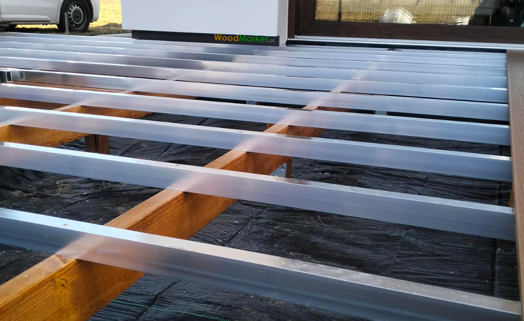 Konstrukcja została wykonana z odpowiednio dobranych legarów aluminiowych, które zapewniają stabilność i właściwą wentylację całej powierzchni. Następnie deski kompozytowe zostały zamontowane w systemie umożliwiającym naturalną pracę materiału oraz estetyczne, równe szczeliny pomiędzy deskami ( to wszystko dzięki systemowi ukrytego montażu!).